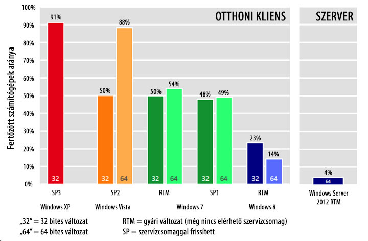A megfertőződési arányok különböző Microsoft operációs rendszereken