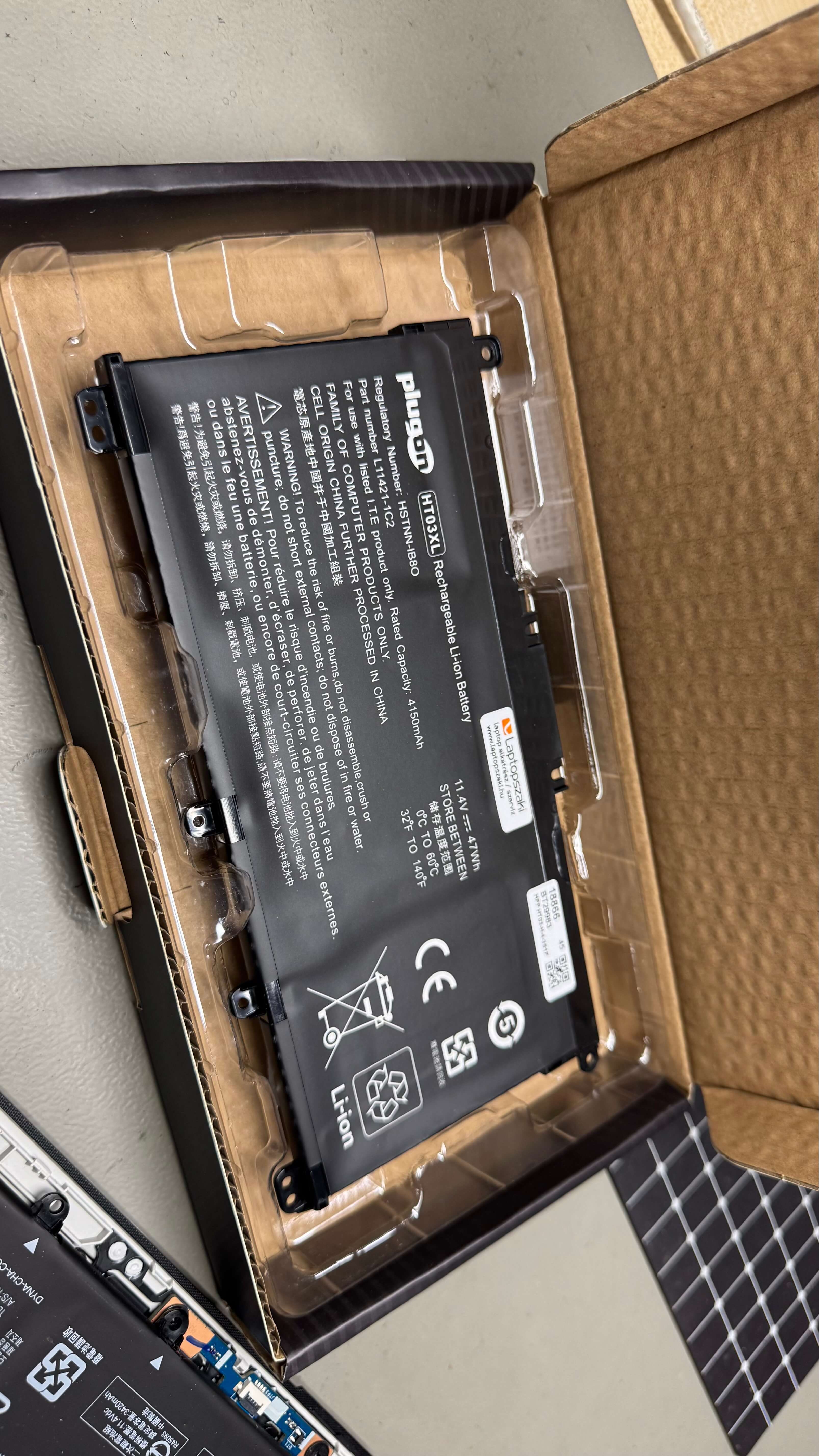 Miután eltávolítottuk a régi, már lehasználódott, gyári akkumulátort, jöhetett a helyére az új alkatrész. Ebbe a gépbe egy saját márkás PlugOn Pro akkumulátort szereltünk, ami nagyobb üzemidőt fog biztosítani, mint a gyári elődje a legelső napján.