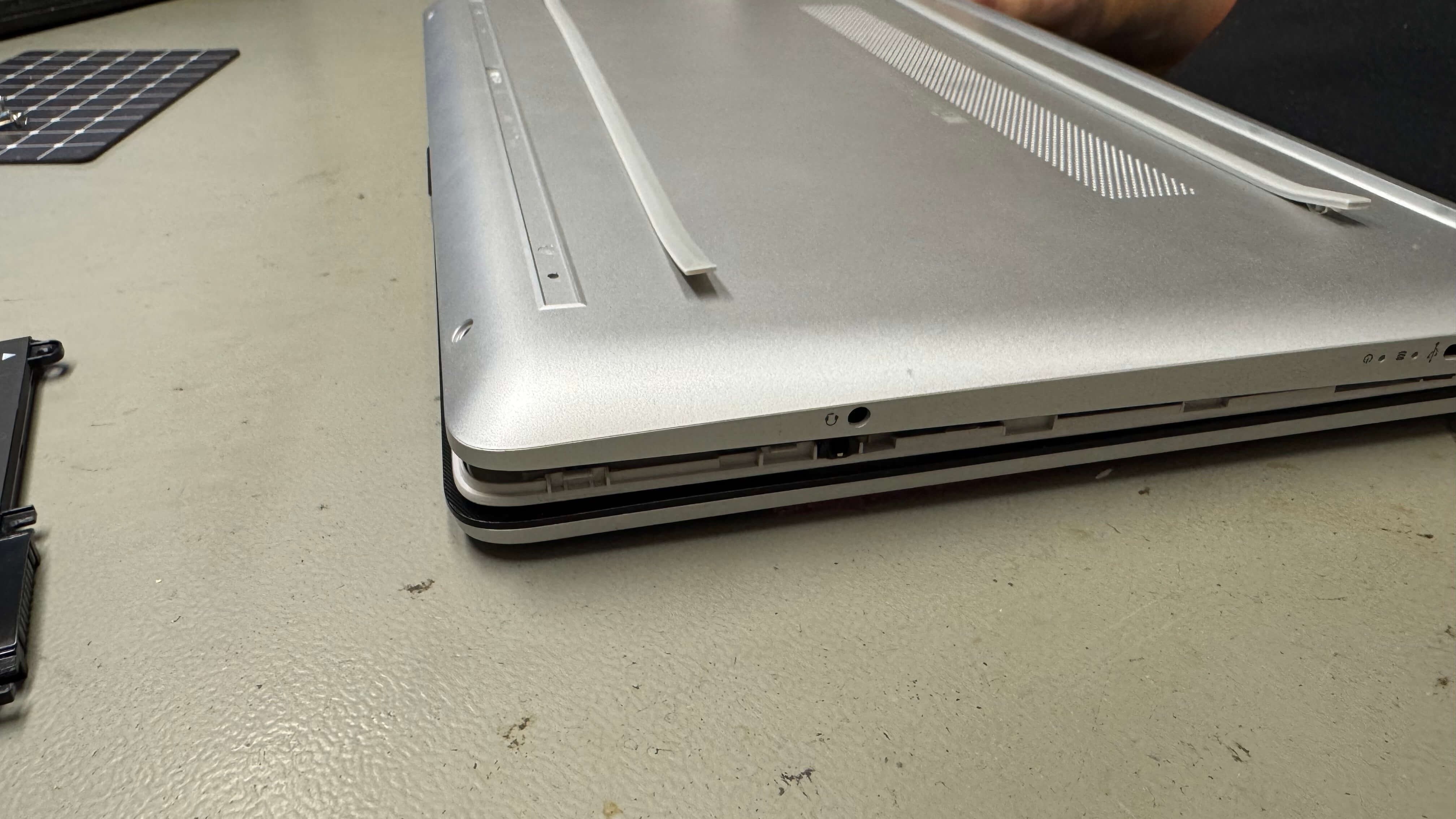 Miután meggyőződtünk róla, hogy minden csavart kihajtottunk a hátsó fedélből, egy műanyag célszerszámmal óvatosan alányúlunk és szétpattintjuk a műanyag patentokat. Miután körbeértünk, a laptop és az alsó fedél feszegetés nélkül elválik egymástól. Ha nem, vagy egy csavar maradt bent, vagy egy műanyag patent még nem lett szétnyitva.