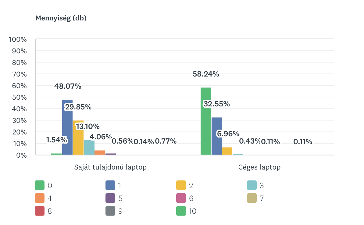 A kitöltők harmadának egy céges laptopja van a háztartásban, 7%-uknak kettő, 1,28%-uknak pedig három is. Többségben vannak viszont azok, akik nem használnak a munkahelyük tulajdonában lévő hordozható számítógépet: a felmérésben résztvevők 58 százalékának egyáltalán nincs ilyen eszköze.