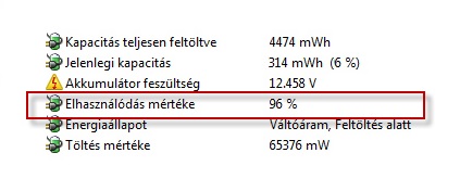 A Windows az akkumulátorból kiolvasott gyári adatokból képes kiszámolni azt is, hogy a gyári 100%-os kapacitás hányad részénél jár az akkumulátorod. Ez az érték az „elhasználódás mértéké”, amely ha meghaladja a 60%-ot, akkor a Windows bizony jelezni fogja ezt neked.