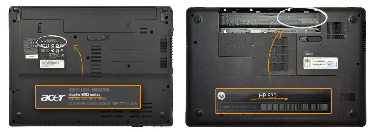3) Válassz sorozatot: Hajtsd le a laptop fedelét és fordítsd a hátára. A laptop alján található címkén, vagy az akkumulátor alatt található címkén tudod ellenőrizni a típust, amelyet „MODEL” vagy „MODEL NUMBER”-ként szoktak jelölni.
