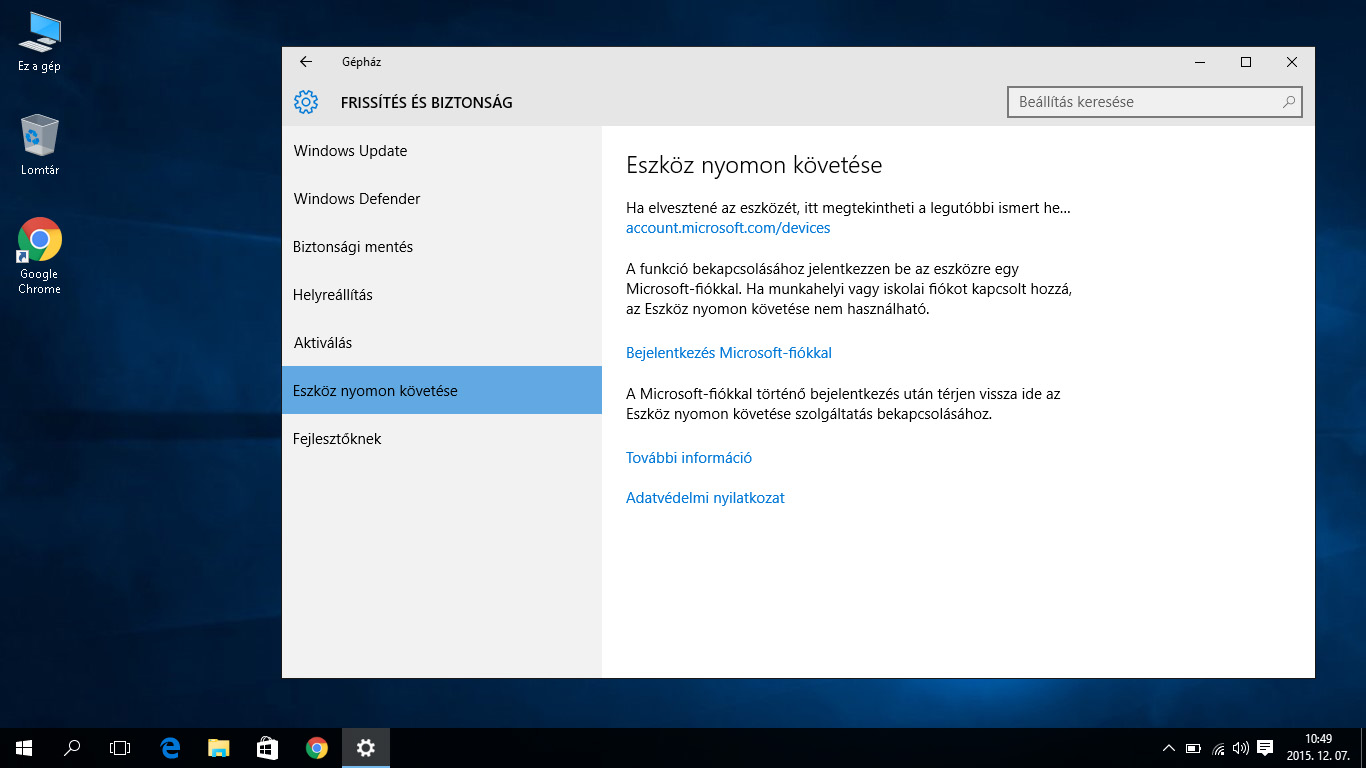 Az eszköz nyomon követése opciót a Gépházban, a Frissítés és biztonság alatt találod