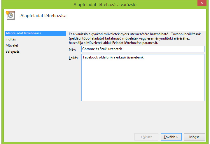 A megnyíló varázslóban elég csak az egyszerű instrukciókat követned. Először is adnod kell egy nevet és egy leírást a feladatnak. Az első kötelező, a második nem. Olyan nevet válassz, amiről egyértelműen be tudod a későbbiekben azonosítani a feladatot.