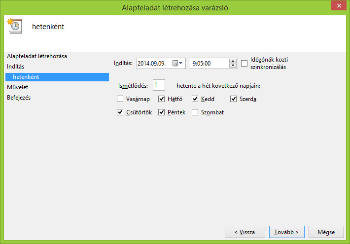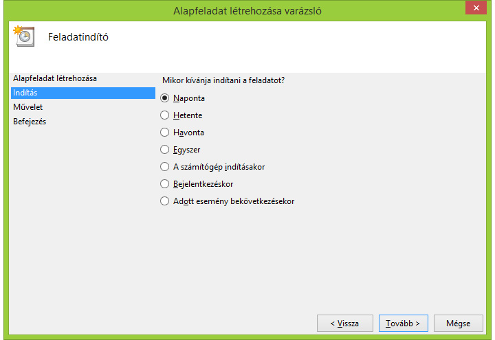 A feladat létrehozásakor beállíthatod, hogy naponta, hetente, havonta, egyetlen egyszer, minden számítógép indításkor, minden bejelentkezéskor vagy egy bizonyos esemény bekövetkezésekor lépjen életbe. A hetente elnevezés csalóka, hiszen ott szelektíve kiválaszthatod, mely napokon szeretnéd a feladatot futtatni.