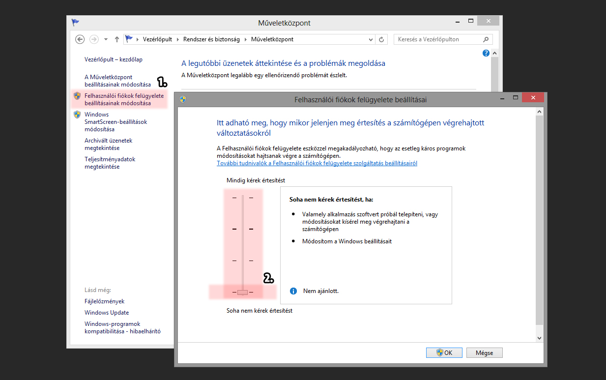 3. A megjelenő panel bal oldali sávjában a Felhasználói fiókok felügyelete beállításainak módosítása opciót válaszd (az ábrán 1.-el jelölt).