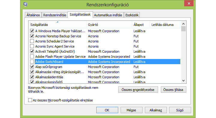 Elsőként a harmadik fület, a „Szolgáltatások” névre hallgatót nyissuk meg. Itt találjuk azon programmodulokat, amelyek nem önálló programok, a Windows bekapcsolásakor betöltődnek, és bizony van közöttük felesleges is.