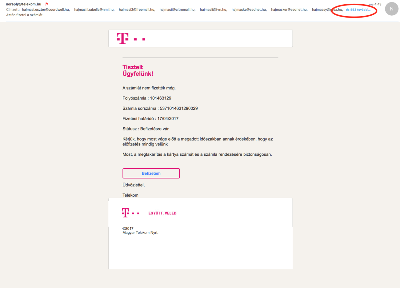 Kiváló példa a napokban felbukkant ál-Telekom levél, melyben fizetésre szólítanak fel. Gyanús kell legyen a pongyola fogalmazás, a torz logó, a fizetendő összeg hiánya és a többszáz címzett.