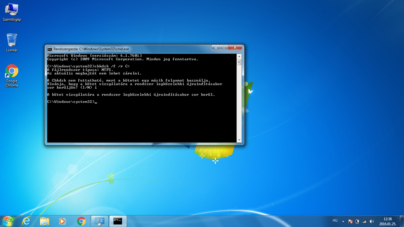 A végeredmény ugyanaz, mint előbb, szintén a következő indításkor kerül futtatásra a lemez ellenőrzése.