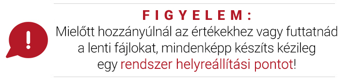 Tehát itt hívjuk fel a figyelmed, hogy csak és kizárólag akkor állj neki, ha biztos vagy a dolgodban. Ellenkező esetben könnyen egy nem induló / nem működő Windows-al találhatod magad szemben. Mielőtt hozzányúlnál az értékekhez vagy futtatnád a lenti fájlokat mindenképp készíts kézileg egy rendszer helyreállítási pontot!