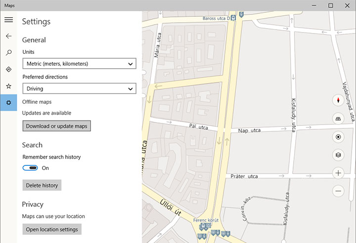 A Windows 10-ben egy teljesen megújult térkép applikáció is helyet kapott, ami a Windows 8-as térképpel ellentétben immáron offline, azaz internet nélküli üzemmódban is képes működni.