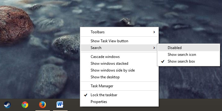 Kattints a tálcán jobb gombbal, majd a Search > Disabled-et válaszd a Cortana keresőmező kikapcsolásához, a virtuális asztalok gombjának eltüntetéséhez pedig a Show Task View button mellől vedd ki a pipát.