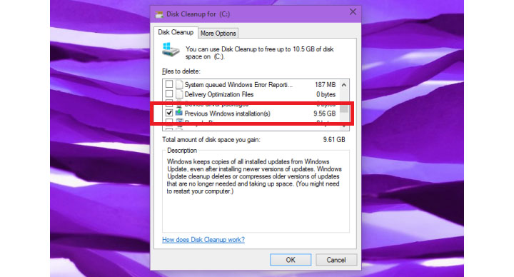 Ha meglévő Windows 7-ről vagy Windows 8-ról frissítettél a Windows 10-re, akkor észrevehetted, hogy a C meghajtón található egy Windows.Old mappa. Ez tartalmazza a régi operációs rendszered, szőröstül-bőröstül. Ahelyett, hogy azt törölnéd kézileg, inkább nyisd meg a Disk Cleanup eszközt (gépeld be a Cortana keresőbe majd nyomj entert), és válaszd ki törlésre a Previous Windows Installation(s)-t, majd nyomj az OK-ra. Valószínűleg 10-12 GB-ot is felszabadíthatsz így a merevlemezedről.
