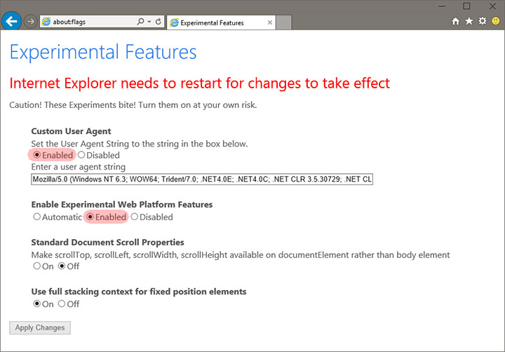 Csak nyisd meg az Internet Explorer 11-et, és gépeld be a címsorba: about:flags. A megjelenő oldalon az „Enable Experimental Web Platform Features” sor alatt bökd át az „Automatic”-ot „Enabled”-re. Ezután a „Custom User Agent” alatt is állítsd „Enabled”-re és készen is vagy.
