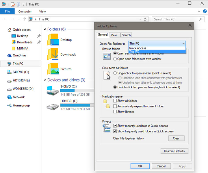 Zavar, hogy a tálcán a fájlkezelő ikonjára kattintva nem a Sajátgép, hanem a legutóbb megnyitott mappák jelennek meg? Ez már az első Windows 10 tesztverzió óta így van, de a tesztelők imái meghallgatásra találtak. Nyisd meg a Fájlkezelőt, kattints a felső sávban a View fülre, ott pedig a jobb szélen az Options gombra. A megjelenő ablakban az Open File Explorer to-nál állítsd át Quick Access-ről a This PC-re.